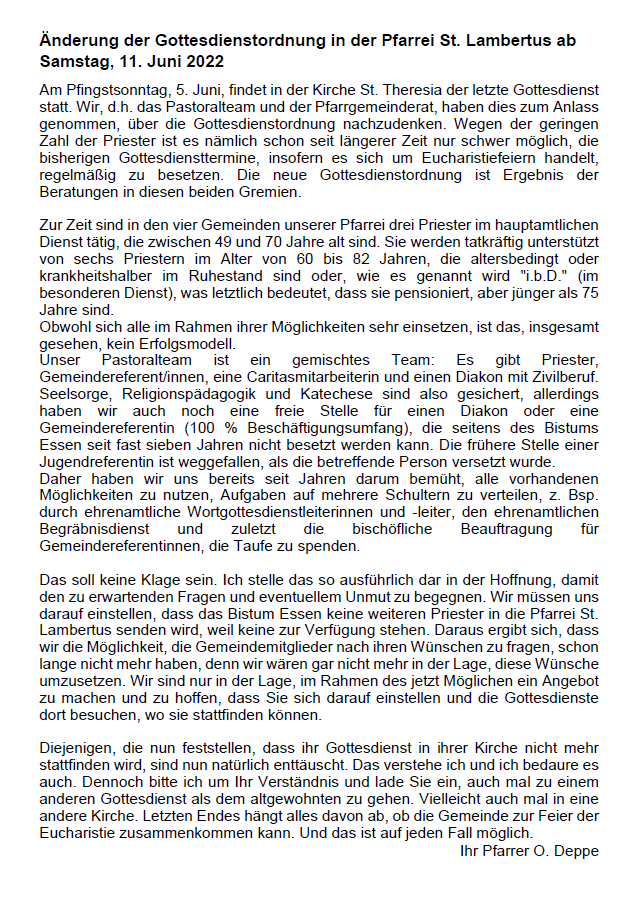 Änderung der Gottesdienstordnung in der Pfarrei St. Lambertus nach Pfingsten 2022