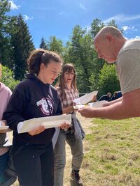 Nach dem Frühstück am Sonntag ging es an die Vorbereitung der Messe. Es mussten Fürbitten und Gebete formuliert , Bänke und Stühle nach draußen gebracht und die Musik aufgebaut werden und die Kinder schwirrten aus, um für den richtigen Blumenschmuck zu sorgen. Nach der Hl. Messe, die Pfarrer Deppe mit uns draußen gefeiert hat und in der der Hl. Geist durch den aufkommenden Wind spürbar wurde, kamen wir noch einmal zum Mittagessen zusammen.