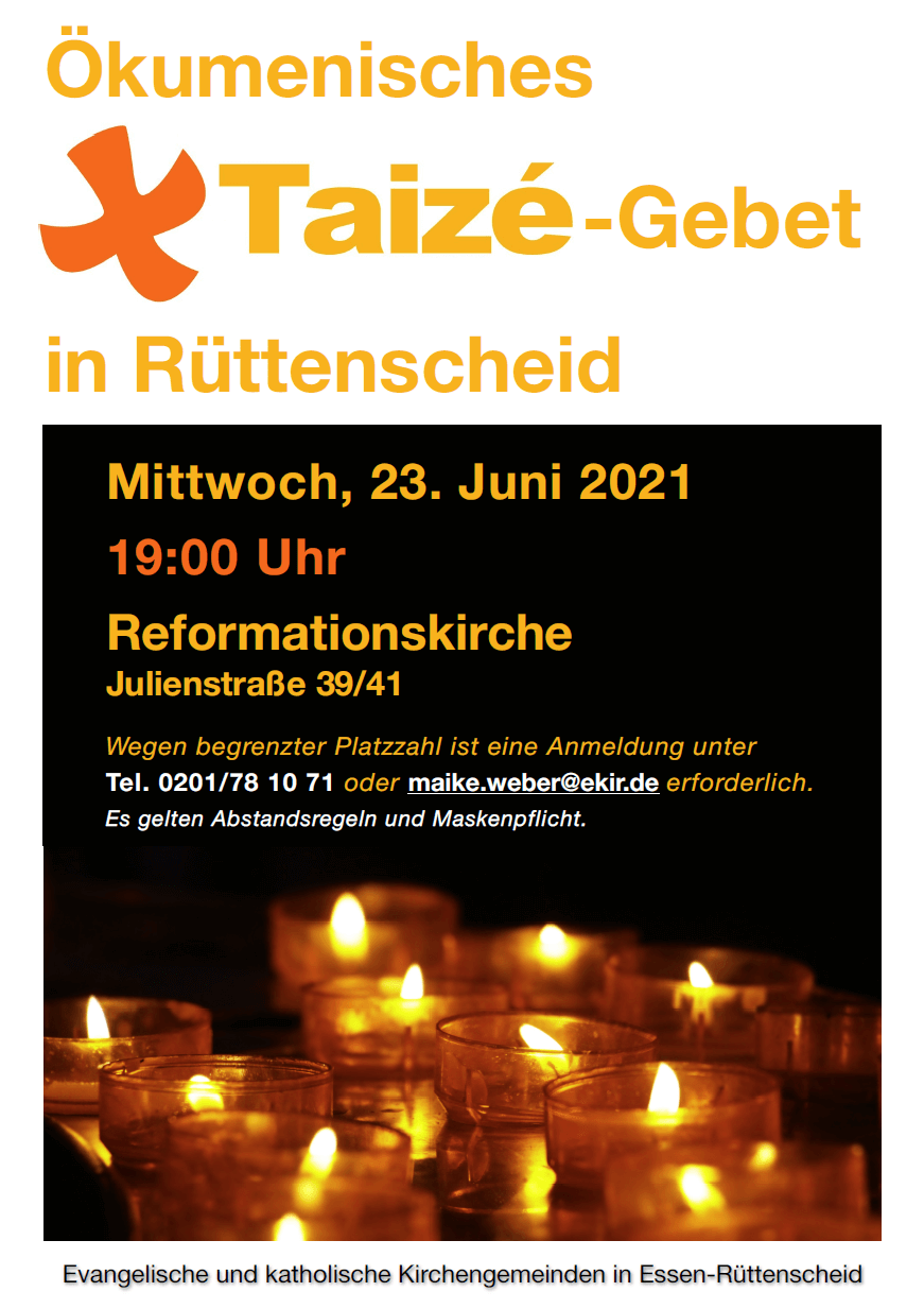 Am Mittwoch, 23.6.2021 um 19.00 Uhr laden wir herzlich ein zum Ökumenischen Taizé-Gebet der evangelischen und katholischen Kirchengemeinden.