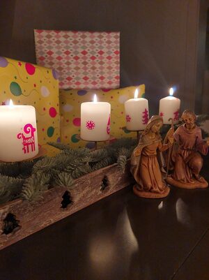 Wir kamen schon am 8. Dezember zu unserer neuen Herbergsfamilie und waren ein bisschen aufgeregt, ob alles gut funktionieren würde. Der Einzug in die neue Herberge musste sehr gut mit der vorherigen Herbergsmutter koordiniert werden, da unsere neue Familie am Abend nicht anwesend war. Dies hat aber problemlos funktioniert: Wir haben einen sicheren und trockenen Platz vorgefunden. Nach später Ankunft der neuen Herbergsfamilie konnten wir mit unserem Eselchen einen warmen Platz neben einem schönen Adventsgesteck einnehmen. Wir freuten uns alle zusammen die zweite Kerze anzünden zu können, um bei Kerzenschein ein bisschen innezuhalten.