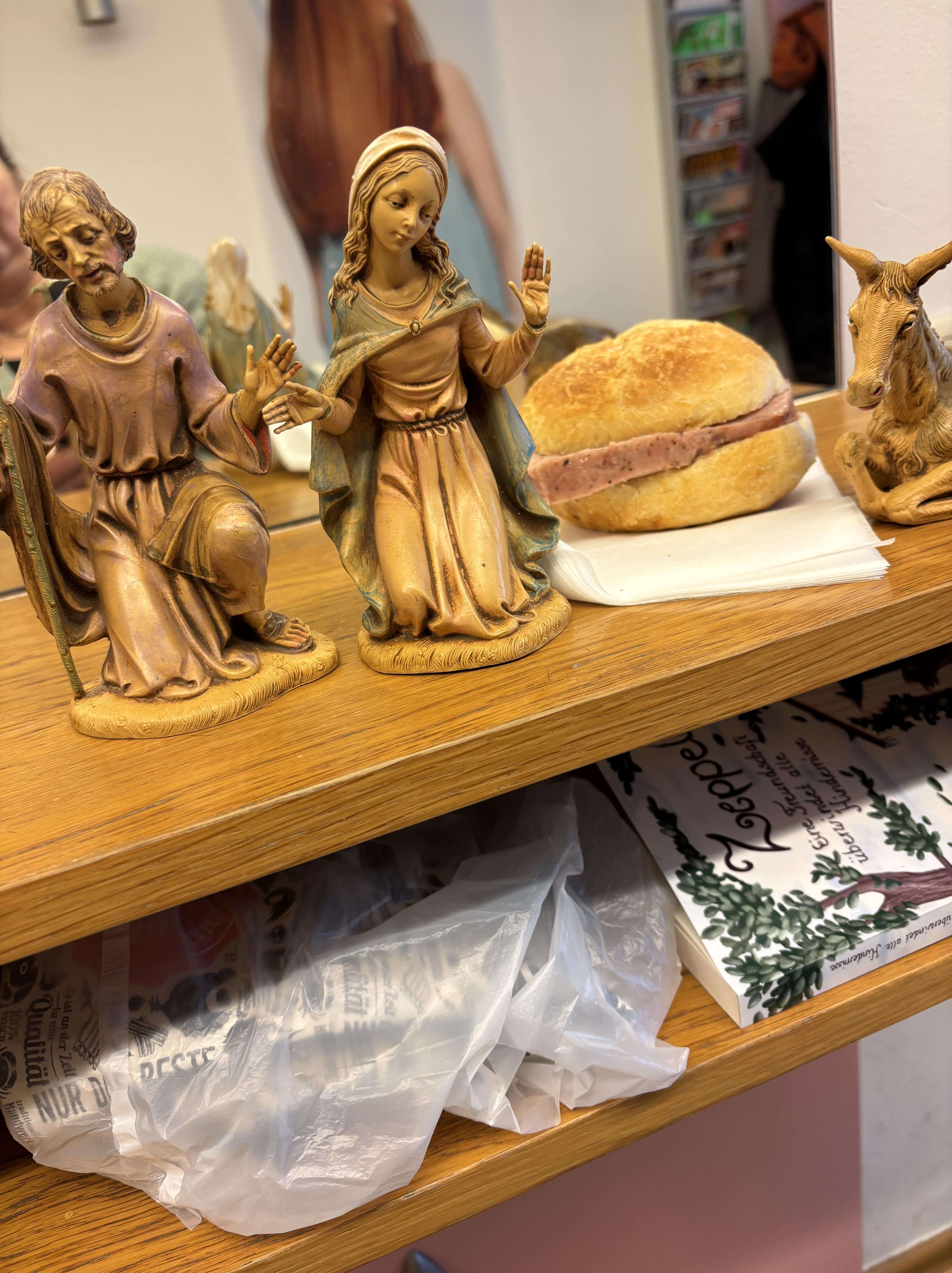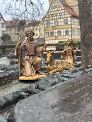 Heute morgen waren wir recht früh in Bamberg unterwegs. Als erstes durften wir uns den schönen Dom in Bamberg anschauen. Josef, Maria und auch der Esel waren sehr von der großen Kirche beeindruckt. Auf dem Rückweg vom Dom sind wir an einer alten traditionellen Metzgerei vorbeigekommen.Dort haben wir zum Frühstück erst einmal ein Brötchen mit Leberkäs gegessen. Nach dem Frühstück sind wir aufgrund der schlechten Wetterlage mit dem Bamberger Hügelbus eine Stunde herumgefahren. Nur alleine die vielen Kirchen in Bamberg und davon gibt es 24 haben uns sehr beeindruckt.Wir durften sogar zwischendurch aussteigen und haben uns die Altenburg erst einmal angesehen. Toll!! Zum Glück waren wir nicht zu Fuß unterwegs. Das wäre für Maria auch viel zu anstrengend gewesen.