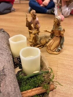 in einem großen Raum mit vielen Kindern steigen wir aus unserem Transportmittel. Die Kinder sitzen im Kreis und begrüßen uns freundlich. Wir sind in der Mäusegruppe der Kita St. Lambertus gelandet und stellen uns vor. Die Kinder erzählen uns, dass sie einen Esel namens Elias kennen. Jeden Tag geht die Geschichte über Elias weiter und die Kinder laden uns dazu ein, sie mit anzuhören. Am Adventskranz machen wir es uns gemütlich und lauschen…