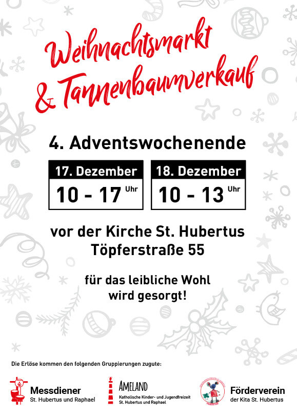 Herzliche Einladung zum alljährlichen Weihnachtsmarkt mit Tannenbaumverkauf von Messdienern und Ameland-Freizeit.