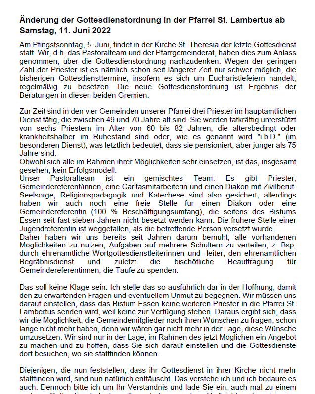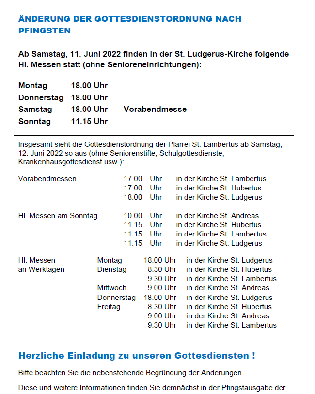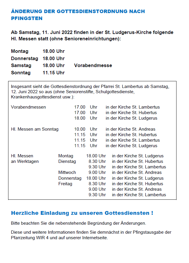 Änderung der Gottesdienstordnung in der Pfarrei St. Lambertus nach Pfingsten 2022