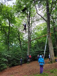 Der Samstag Vormittag war geprägt von verschieden Workshops: die Jugendlichen konnten eigene Grenzen auf dem Kletterparcour überwinden, andere wanderten zum Lörmecke-Turm und spürten dort, wie ihnen der Gesit um die Ohren wehte. Die Erfahrung, dass manche Dinge nur gemeinsam gehen, machten sowohl die Erwachsenen, die sich im Kanon singen übten, als auch die Kinder, die bei verschiedenen Kooperationsspielen nur gemeinsam ihr Ziel erreichten. Für die ganz Kleinen gabe es eine Vorlesegeschichte und gebastelt wurde natürlich auch.