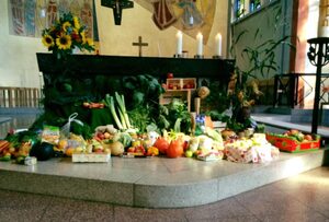 Alle sind eingeladen, Erntedankgaben (Obst und Gemüse, gerne aber auch haltbare Lebensmittel) für die Ernteprozession mitzubringen. Diese werden nach dem Gottesdienst dem Café Schließfach – Treff für Mädchen und Frauen des Sozialdienstes katholischer Frauen SKF – zur Verfügung gestellt.