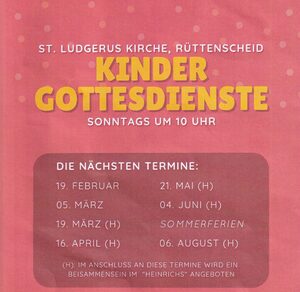 In unserer St. Ludgerus-Kirche finden regelmäßig Kindergottesdienste statt.Im Anschluss an einige Termine wird ein Beisammensein im "Heinrichs" angeboten.Wir freuen uns auf Euch!
