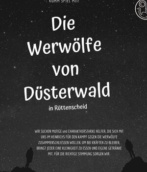 Wir suchen mutige und charakterstarke Helfer, die sich mit uns im Heinrichs für den Kampf gegen die Werwölfe zusammenschließen wollen. Um bei Kräften zu bleiben, bringt jeder eine Kleinigkeit zu essen und eigene Getränke mit. Für die richtige Stimmung sorgen wir.