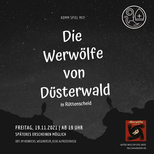 Am Freitag, 19.11.2021 treffen wir uns im Heinrichs für eine lange Werwolf-Nacht. Um bei Kräften zu bleiben, bringt jeder eine Kleinigkeit zu essen und eigene Getränke mit.