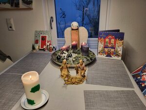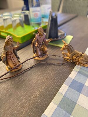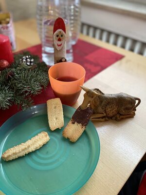 Die Weiterreise im Kinderwagen und mit dem Fahrrad war etwas holprig. Auf dem Weg zur Unterkunft bei der neuen Gastfamilie sind wir noch bei deren Großeltern eingekehrt und haben uns bei Plätzchen, Kerzenschein und Weihnachtsliedern gestärkt. Nach einem verspäteten Mittagsschlaf und leckerem Abendessen ging es dann weiter. In der neuen Herberge haben wir ein warmes Bett neben einem leuchtenden Stern auf der Fensterbank bekommen und durften einer Adventskalendergeschichte von "Schnüpperle" und seiner Schwester Annerose als gute Nacht Geschichte lauschen. Wir haben sehr gut geschlafen, auch wenn Josef ein bisschen geschnarcht hat. Heute morgen wurde Maria noch ärztlich untersucht, weil ihr der Rücken vom großen Babybauch ein bisschen weh tat. Dem Baby geht es zum Glück sehr gut und es wird wahrscheinlich in knapp zwei Wochen - um Weihnachten herum - zur Welt kommen, hat die Ärztin vermutet. Nach einem gemeinsamen Frühstück mit Müsli und Kaffee sind wir dann (mit ein bisschen Wegproviant - etwas von den leckeren Plätzchen von gestern) weitergezogen und schon sehr gespannt, was uns heute erwartet.