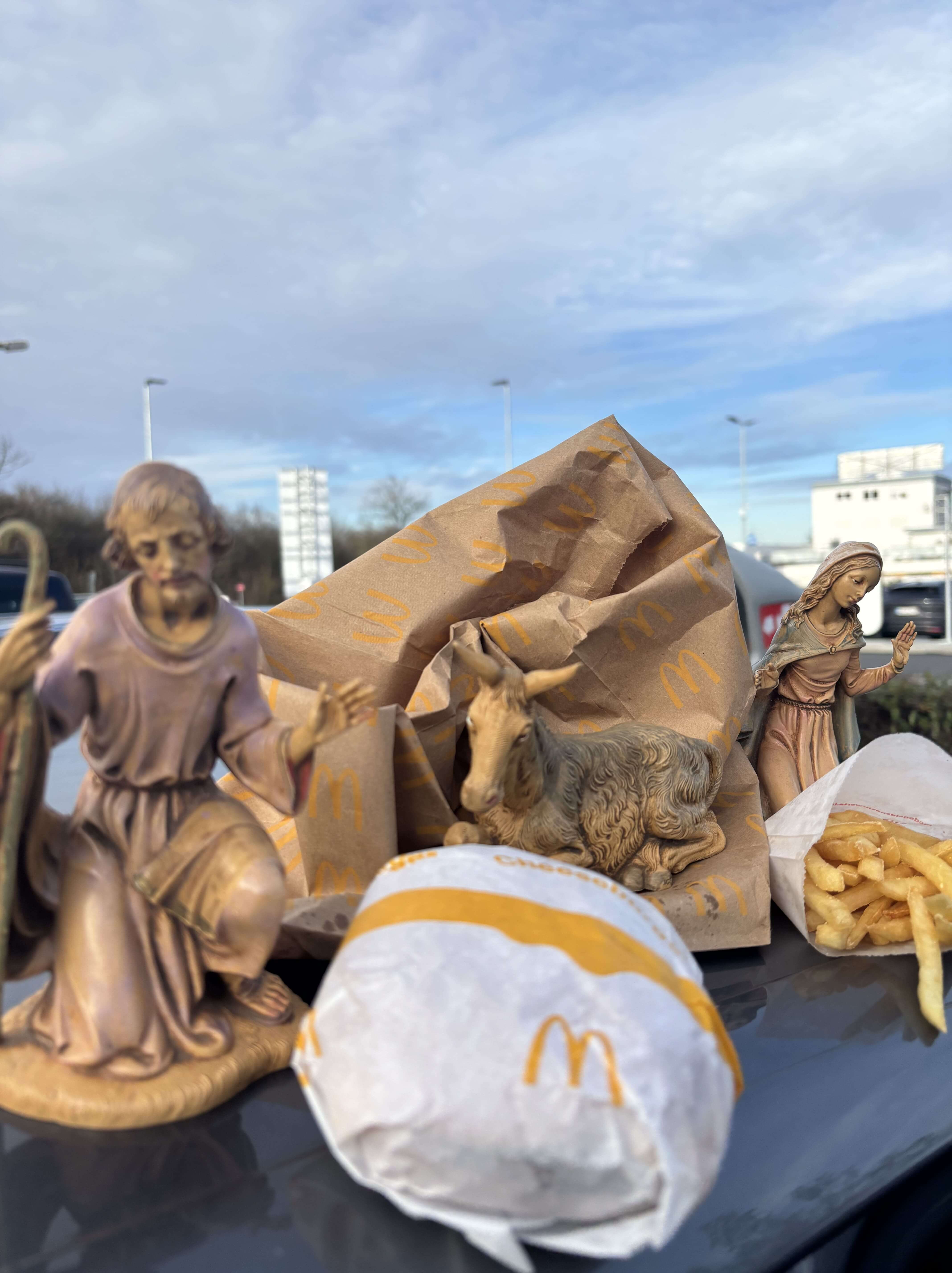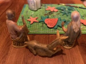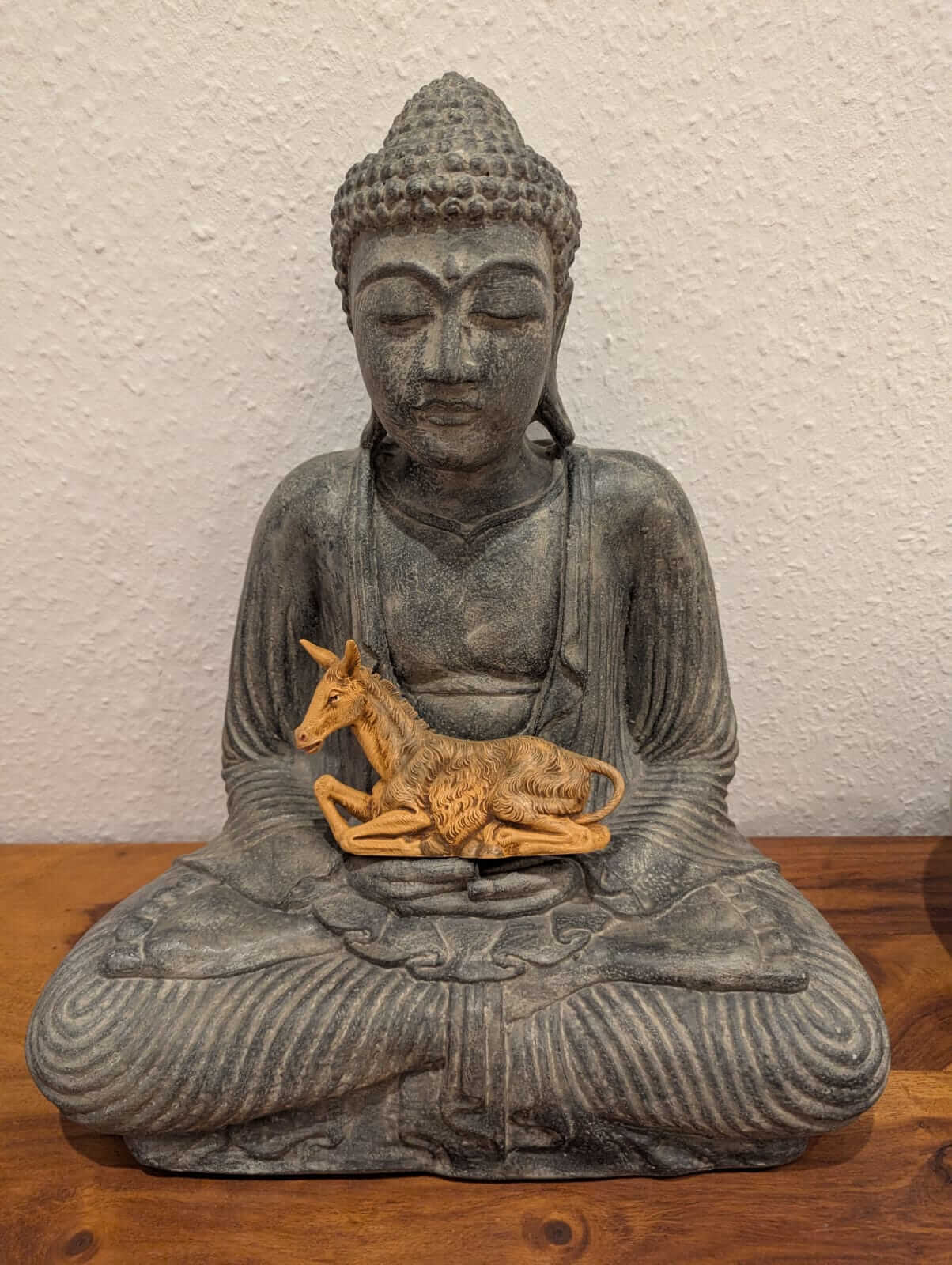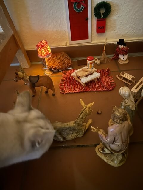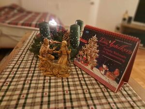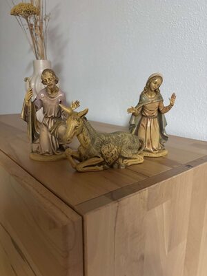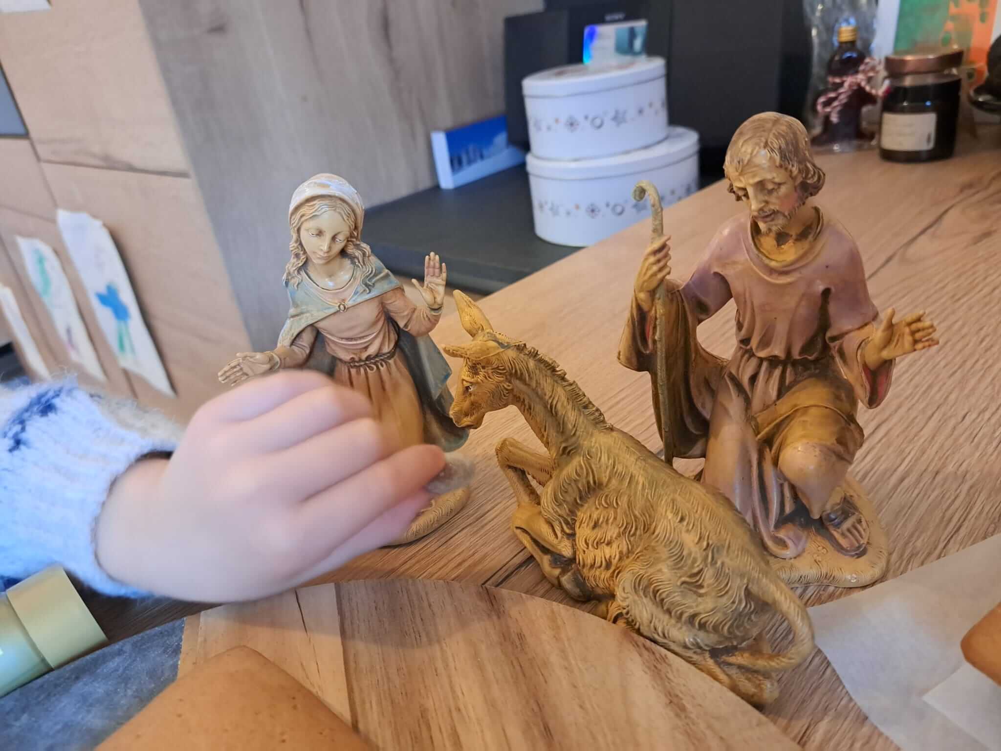 Josef wurde auf eine sogenannte Toniebox gestellt und anscheinend dachte das Kind, er würde singen. Weil ich weiß, wie Josef singt, bin ich schnell geflüchtet, aber er hat wohl den Blick von Maria gesehen und hat uns zum Glück verschont. Nicht, dass vor lauter Schreck das Kind zu früh geboren wird. Bei meiner Flucht bin ich auf einem Berg gelandet, der sich dann aber als ziemlich entspannter Typ namens Buddha entpuppte. Der hat da aber nur gesessen und nichts gemacht, das war mir dann schnell zu öde. Wir haben dann alle zusammen doch noch gesungen und so im Chor klang Josef ganz ok. In den Liedern kamen sogar zwei Menschen vor, die auch Maria und Josef heißen, das fand ich echt lustig.