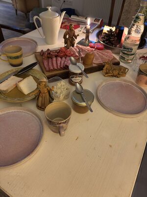 Um 15 Uhr sind alle wieder da. Erstmal wird Kuchen gegessen und Kaffee/Kakao getrunken. Unsere Gastfamilie erzählt, was sie über den Tag so erlebt hat. Dann musizieren wir. Das Kind unsere Gastfamilie übt sein JeKitsinstrument Horn und wir begleiten mit dem Glockenspiel.