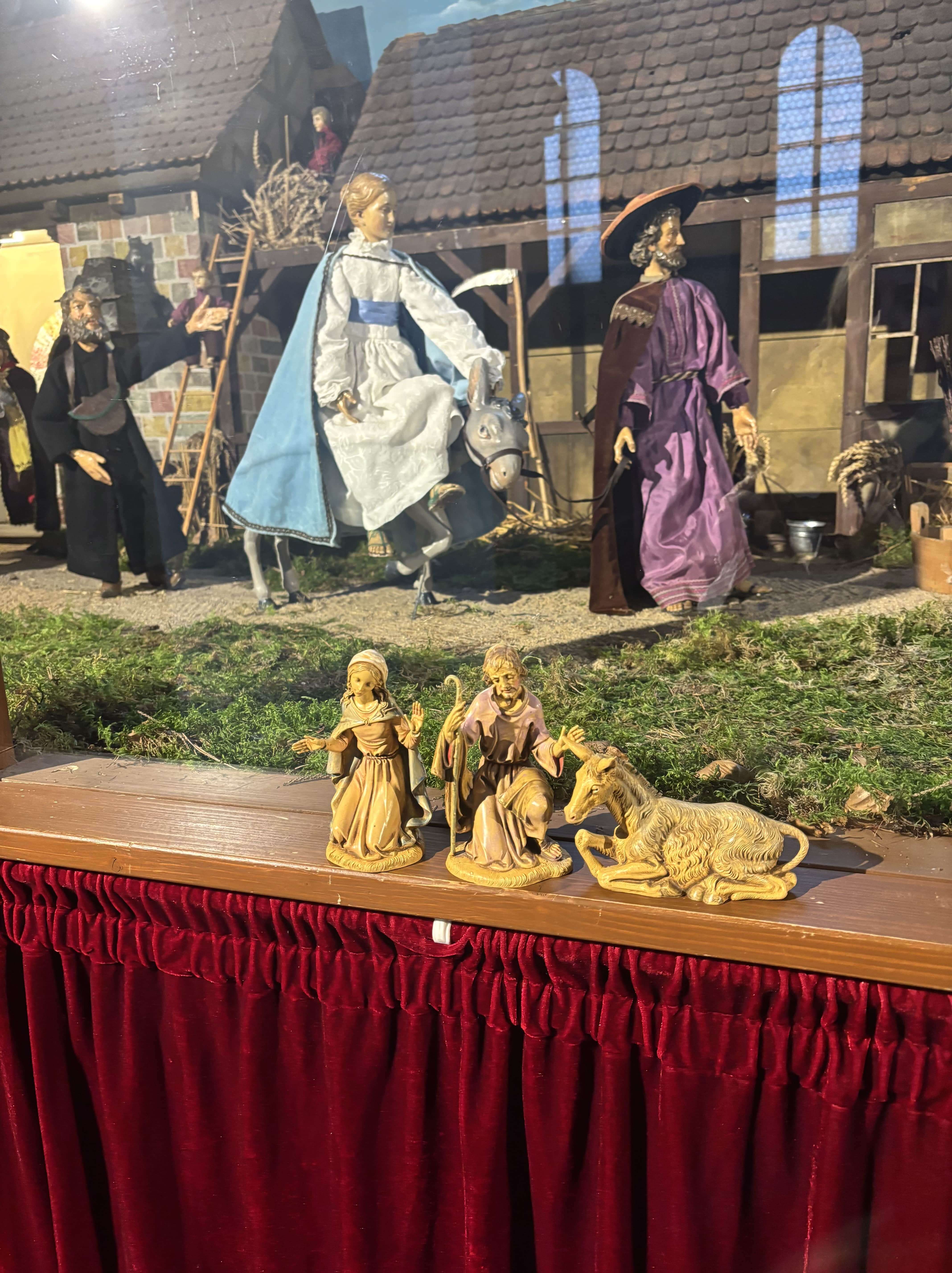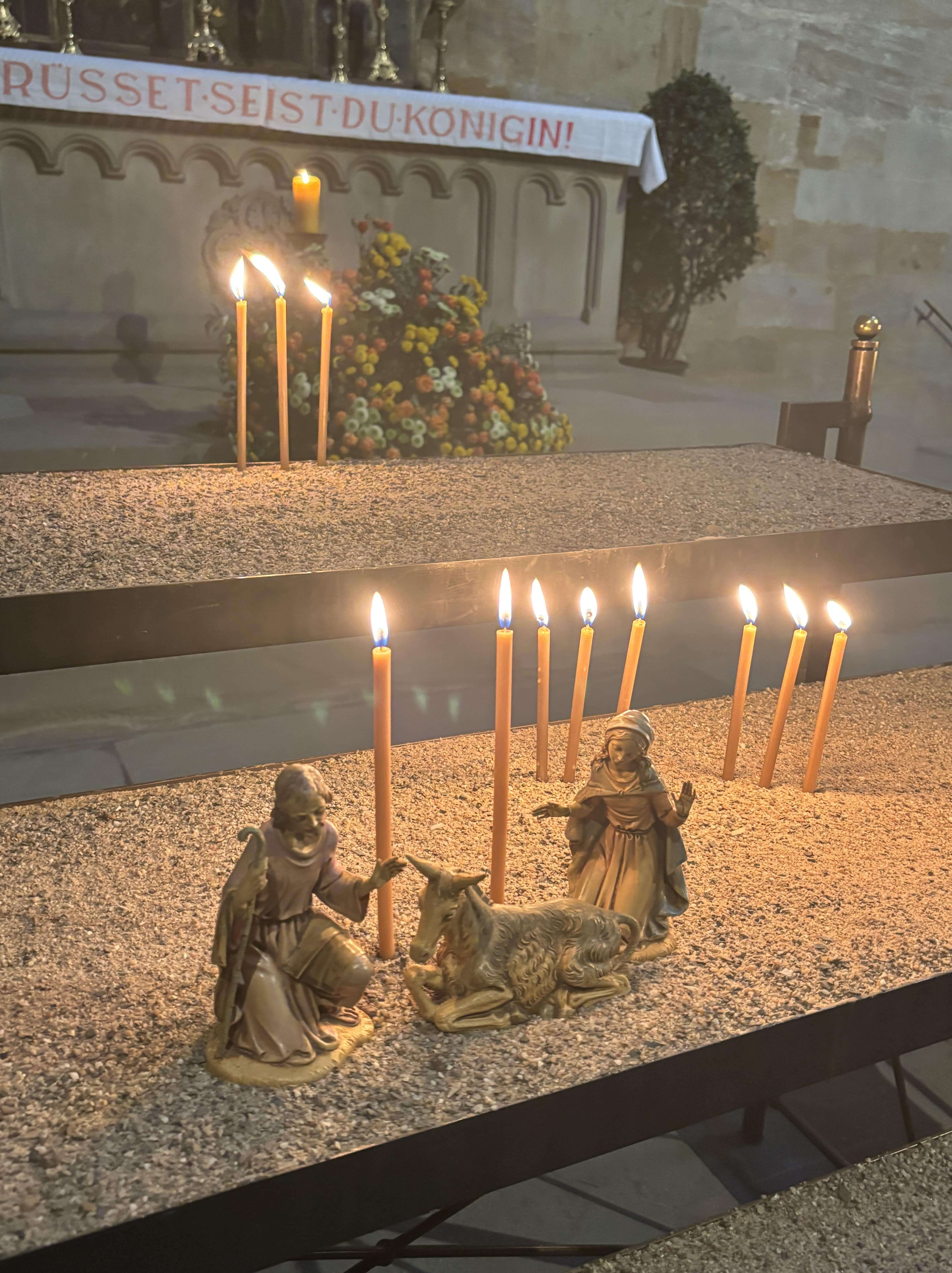 Heute morgen waren wir recht früh in Bamberg unterwegs. Als erstes durften wir uns den schönen Dom in Bamberg anschauen. Josef, Maria und auch der Esel waren sehr von der großen Kirche beeindruckt. Auf dem Rückweg vom Dom sind wir an einer alten traditionellen Metzgerei vorbeigekommen.Dort haben wir zum Frühstück erst einmal ein Brötchen mit Leberkäs gegessen. Nach dem Frühstück sind wir aufgrund der schlechten Wetterlage mit dem Bamberger Hügelbus eine Stunde herumgefahren. Nur alleine die vielen Kirchen in Bamberg und davon gibt es 24 haben uns sehr beeindruckt.Wir durften sogar zwischendurch aussteigen und haben uns die Altenburg erst einmal angesehen. Toll!! Zum Glück waren wir nicht zu Fuß unterwegs. Das wäre für Maria auch viel zu anstrengend gewesen.